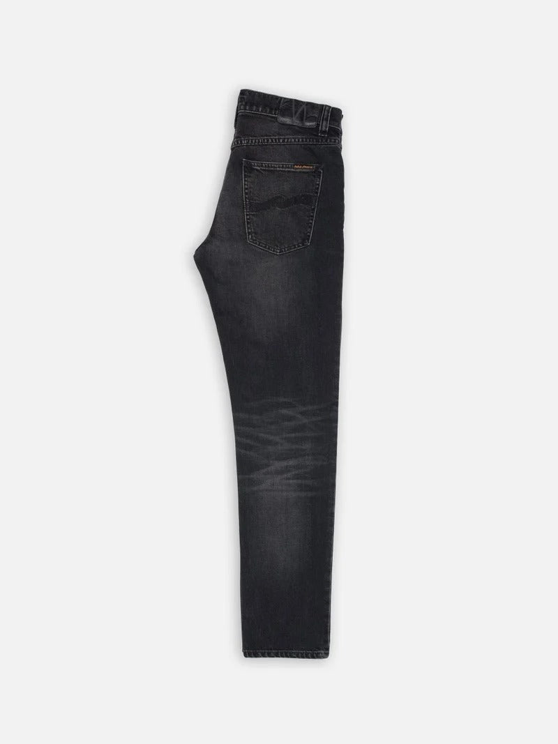 Slim-fit jeans with a slim leg, crafted from pitch-black denim with a defined texture. These jeans feature a striking contrast of highs and lows, enhanced by sharp abrasions and wear marks that deepen their worn-in look. The result is a beautifully rugged, well-aged appearance.