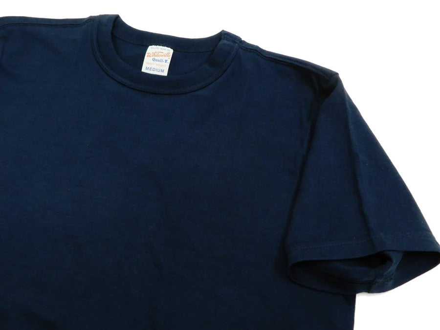 A two-pack T-shirt made of soft, comfortable jersey fabric knitted with 20-count combed yarn. The body is round-bodied, and the collar is made of ribbing knitted with 30-count yarn. The body fabric is sandwiched between ribbing, and the jersey fabric knitted with 30-count yarn is sewn into a tape shape at the same time, resulting in a double-binder neck design. This makes the neck area stronger than a regular T-shirt. The shoulders, hem, and cuffs are sewn with two needles. This two-pack T-shirt can be worn all year round, and is a long-selling Whitesville product.